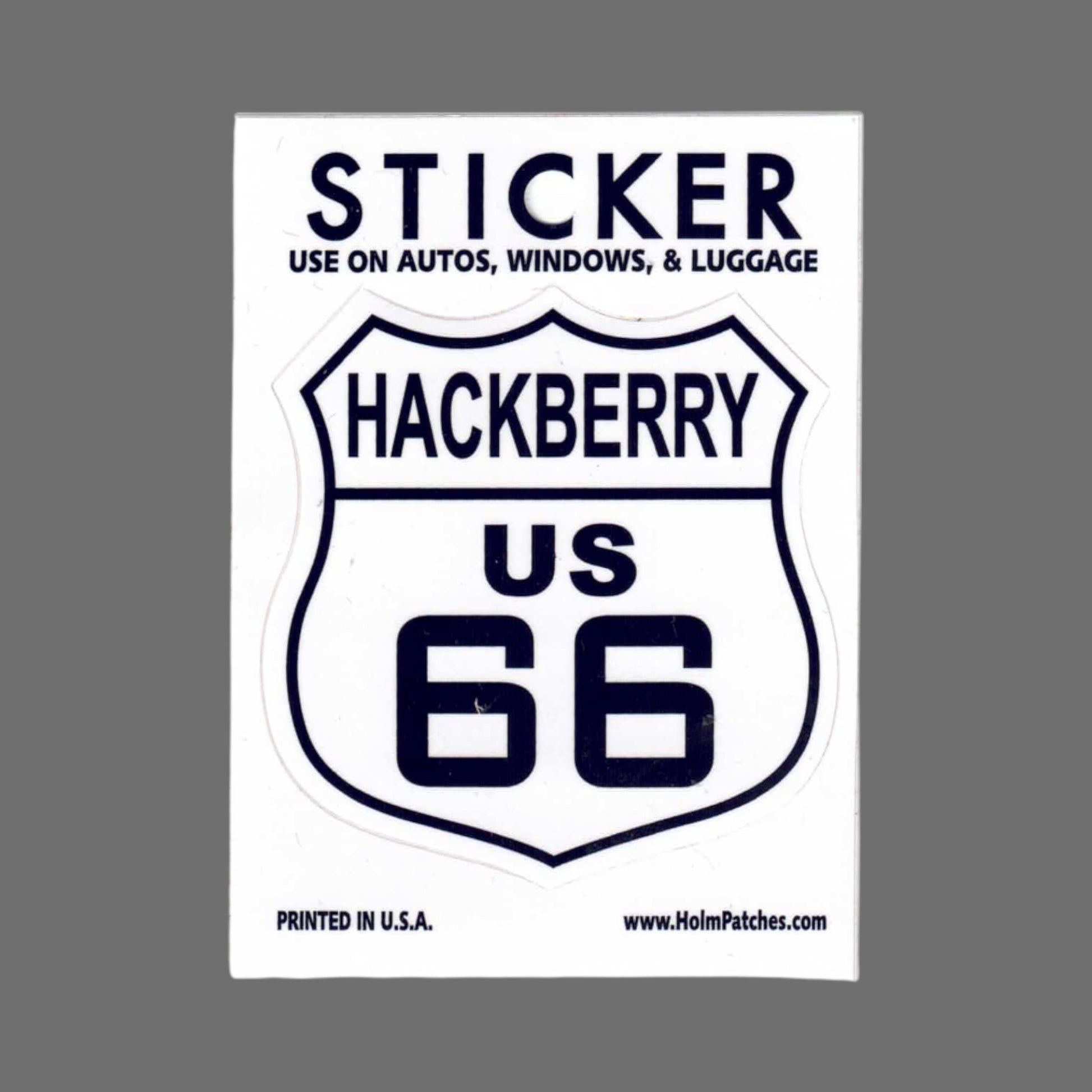 0450-66HACKBERRY - HACKBERRY US 66 sticker. Shield peels off to shape & measures 2.625" wide x 2.75" tall. Printed to be fade resistant in the sun. Suitable for a bumper, outside of a window, or luggage. © Holm Patches