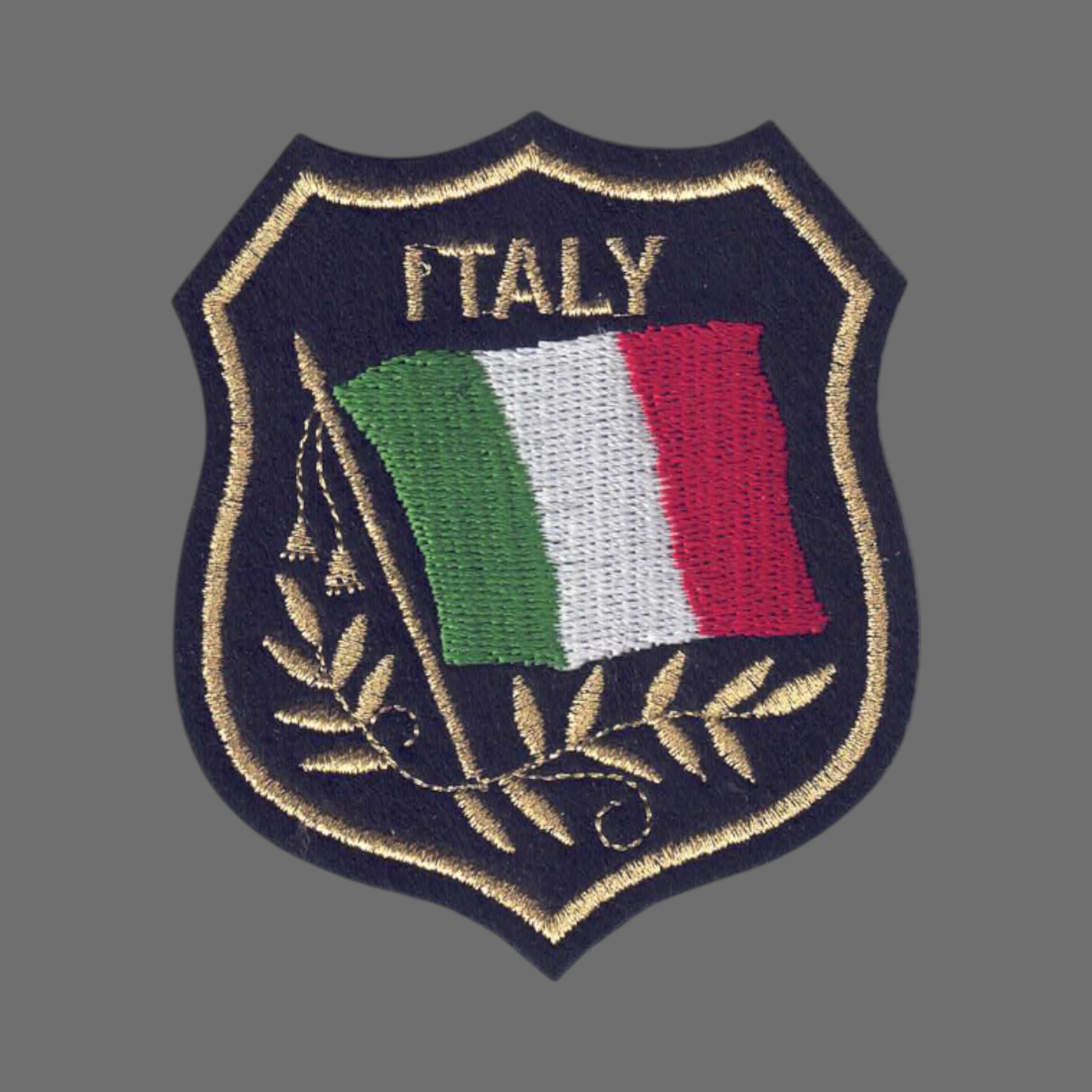 6422 - ITALY Country Flag Shield Embroidered Iron On Souvenir Black with Gold Mylar Thread Patch.