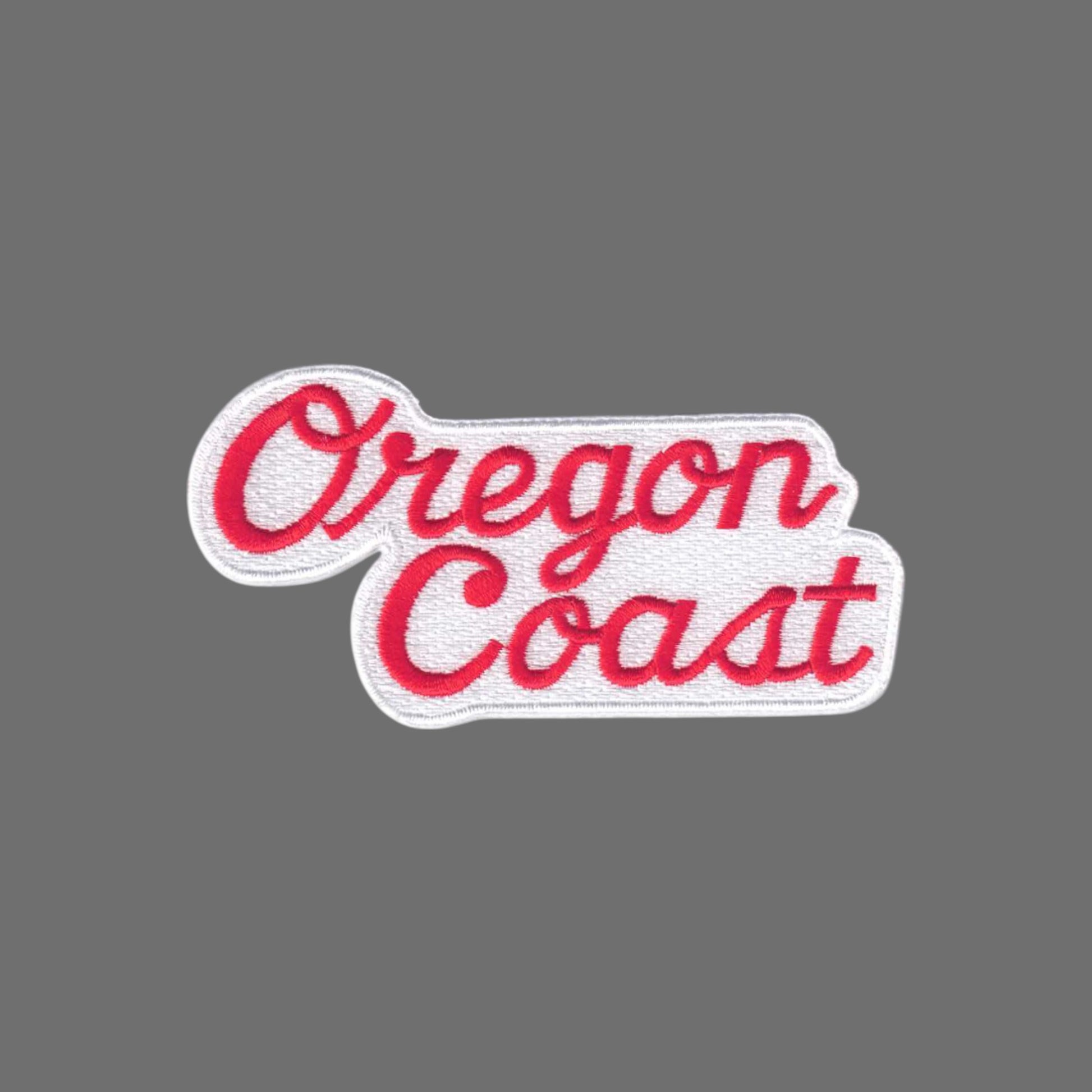 2850-36/39 - Oregon Coast Script Text or Font Red Words on White Souvenir Patch, Badge, or Emblem.